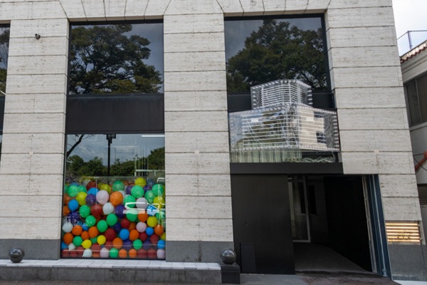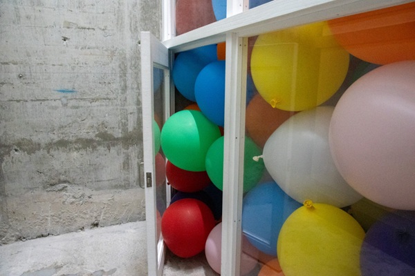 ガラス張りの空間の半分に風船詰め込んだ作品で、外からもよく見えます。