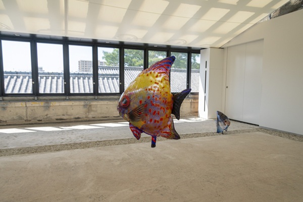 開放的な空間のなかを泳ぐ無数の魚型バルーンが印象的なこちらの作品は、エントランスにも作品を設置しているフィリップ・パレーノ氏によるものです。