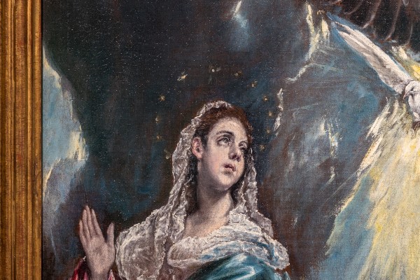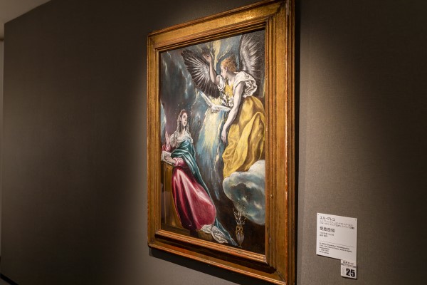 通常、向かって右側に聖母マリア、左側に大天使ガブリエルが描かれるといわれています。しかし、エル・グレコによる「受胎告知」は、古典的な形式の位置とは逆となっています。マニエリスムがひねりを特徴とするからという説もありますが、どうやら左右が逆の「受胎告知」は他にも存在するようです。それは設置場所等の事情により、より一層効果的に見えるように意図して描かれたということも考えられます。この「受胎告知」は当初の設置場所が不明ですが、そのような経緯があったのかもしれません。