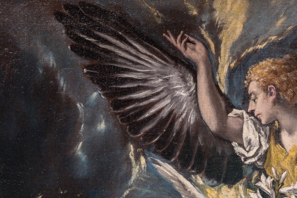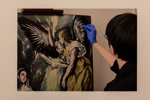 修復によって、作品は当初の姿を取り戻しました。エル・グレコは、カンヴァスの上に赤みがかった下地をまず塗り、その上に透明度の高い油絵具を重ねていました。すべてを塗りつぶすのではなく、その下地を意図的に露出させ、奥行きなどを表現していたのです。ところが、後世の修復の際に、その部分が塗りつぶされていたのです。今回の修復では、そういった部分を下地が見えるようにし、当初の姿が見られるようになりました。ガブリエルの羽の部分が顕著にわかる部分です。