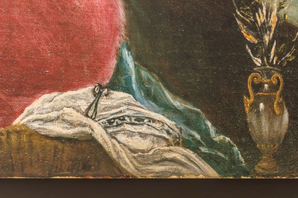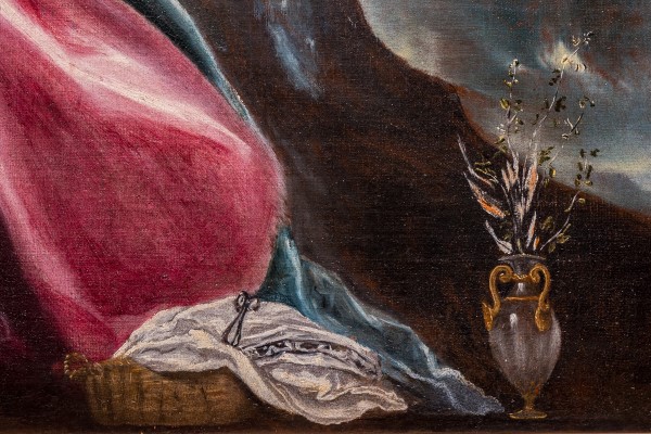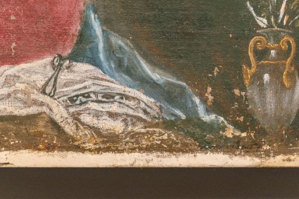 修復中のバスケットと布の部分です。描き換えられている部分が除去されました。