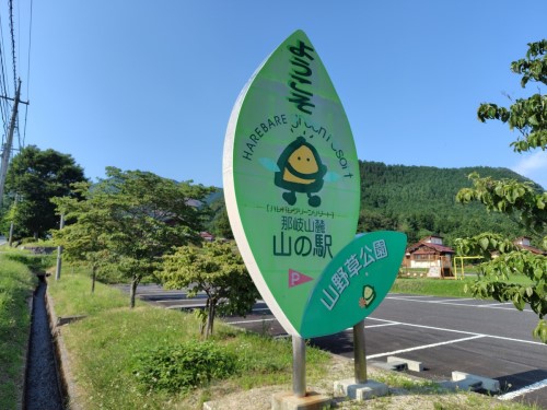 国道53号線から分かれて、坂道を登っていくとアルプスの民家をイメージした2階建ての建物が見えてきます。こちらが「那岐山麓山の駅」。この山の駅には特産品の販売店のほか、レストラン、コテージなどがあり、雄大な景色を眺めながらゆったりした時間を過ごすことができます。