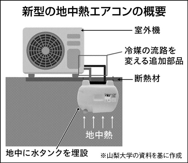 従来の地中熱エアコンは、地中で水を循環させて地上で熱を冷媒に伝える「間接方式」で、深さ100メートルの掘削が必要だ。山梨大の武田哲明元教授は地中に冷媒を流して効率を高める「直接膨張方式」を開発したが、30メートル掘る必要がある。