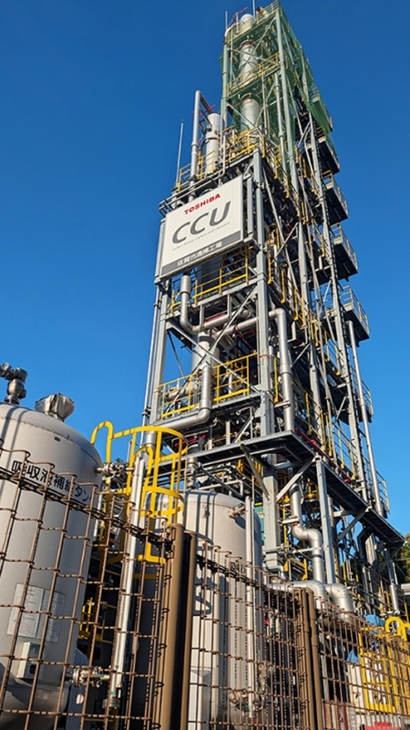 JR佐賀駅から4キロメートルほど離れた地域に清掃工場がある。高い煙突のある外観は、普通のゴミ焼却場だ。建物の裏へと回ると、配管が複雑に重なりながら真っすぐ伸びた装置がある。CO2の吸収塔だ。CO2を吸着するアミン溶液が入っており、ゴミの焼却で発生した排ガスからCO2を分離し、地上のタンクにためている。