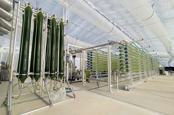 熊谷組の藻類培養装置。奥ではサーモンの養殖やミント栽培が行われている