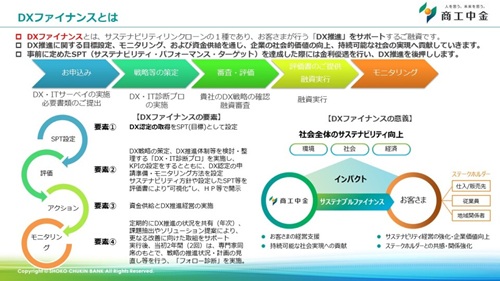 DXファイナンスとは、DX推進をサポートするサステナビリティ・リンク・ローンである。単なる資金提供ではない。DXファイナンスにあたって取り組む「DX診断プロ」を通じ企業が野心的な目標を掲げ、その実現に向けて歩む道のりを金融機関が支援する伴走支援型融資だ。