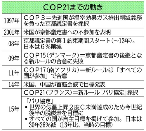 13年のポーランドでのCOP19で、各国が自主的に目標を決めることにした。交渉によって各国の削減義務を決定する京都方式から転換し、参加ハードルを下げた。14年には米国と中国が首脳会談で一緒に目標を発表するなど、世界の主導者たちも新ルール合意を後押しした。